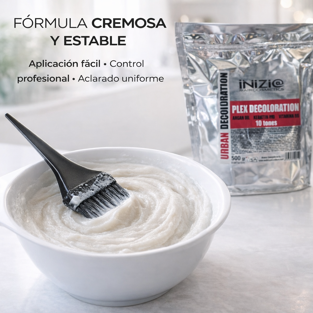 El Polvo Decolorante con Plex de INIZIE está diseñado para lograr una aclaración profesional de hasta 10 tonos, ofreciendo un rendimiento de salón. Su fórmula incorpora Aceite de Argán, Keratina Pro y Vitamina B5, ingredientes que acompañan el proceso de decoloración mientras ayudan a mantener el cabello con mejor aspecto y sensación tras el servicio.